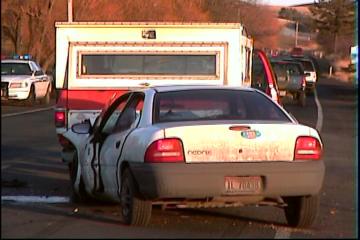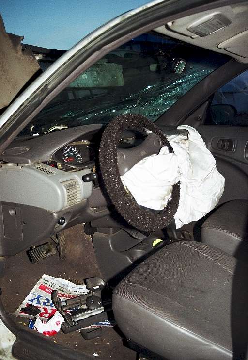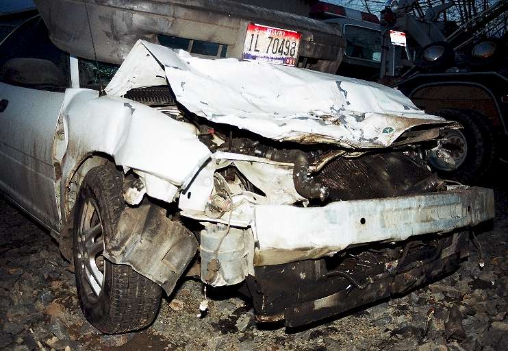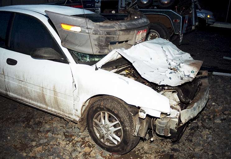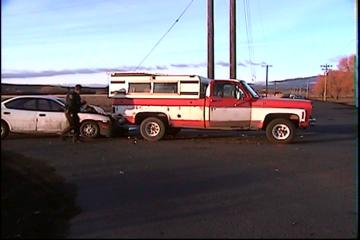 Pickup CrashDecember 8th, 2002.I'm okay (a little bit of a sore neck for a few days). About 2:50 PM I was on the Moscow-Troy highway going east at the golf course. I was waiting for some oncoming traffic to go by so I could take a left. She skidded 121 feet but the ISP officer said she was probably still going 50 MPH when she hit. I was driving the pickup with Ry as my passenger. He has a sprained neck muscle (according to the ER physician) that is causing his right arm to feel weak and tingly. The driver of the other vehicle looked pretty bad to me. She was hyperventilating and her arms were about chest height with her hands sort of contracted and she was vigorously shaking all over. Her eyes were closed and she didn't show any response to people talking to her. The ambulance took her away on a stretcher. Ry went into ER about 6:00 PM when the pain started really kicking in. The doctor that treated him said she treated the other driver and that she is going to be fine. The pickup was shoved about nine or ten feet with all wheels locked. The rear bumper of the pickup was folded up underneath the pickup and portions of it poked up through the bed. That was an almost new bumper too. I had received a new one after getting rear ended on I-405 a couple years ago. Ry's arm permanently caved in the dash board just above the jockey box. The rearview mirror was knocked off I don't know if this was from the impact or because one of us hit it as we bounced around inside the cab. The cup of pop (from McDonalds) was sprayed all through the interior. An ice chest in the back of the pickup got a hole punched in it and punched a hole into a milk jug that was inside the ice chest. The canopy was displaced about six inches to the rear. There was a flexible plastic mixing bowl in back (we had just gone to the range to test out some explosives) that was shattered. The latches to the door of the canopy tore through their settings as if someone had kicked their way out from the inside. The tin on the right side of the pickup is folded with the bumper. The end-gate doesn't close on the right side without some encouragement from my size 14 boots. Both vehicles were considered totaled although the pickup still is drivable. My calculations differ from what Ry recalls the ISP officer said. My