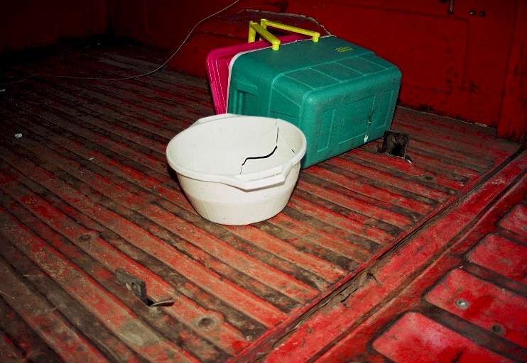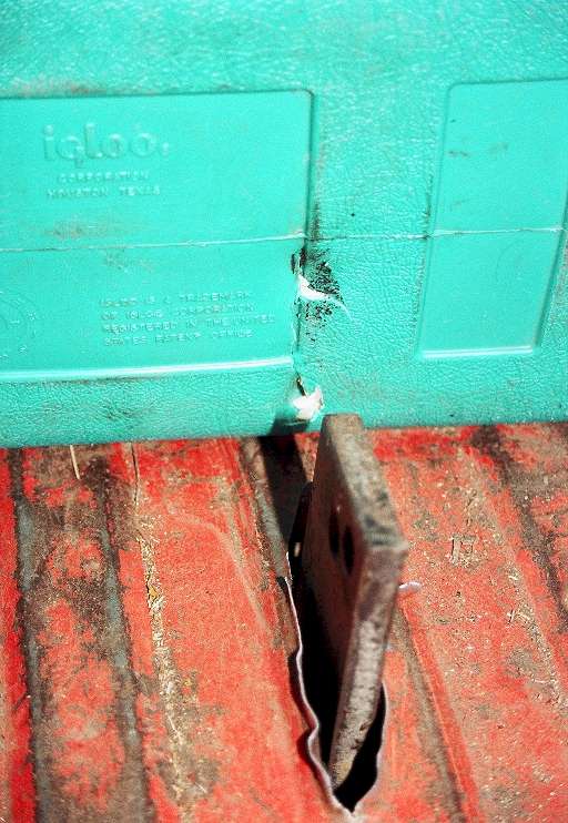 Close up of the ice chest and the piece that punctured it. It also punctured a milk jug inside the chest. It was nearly empty and it was quite surprising that the chest did not just bounce away. The speed with which it came through the bed must have been quite high.