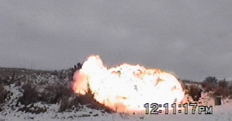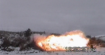 December 2001631 is a particular type of FlashTek explosive which is impact sensitive and can be reliably detonated with a centerfire rifle. This explosive was used to disperse and vaporize the fuel (ordinary gasoline). It was hoped that it would also ignite the fuel but the high temperatures are very short lived. Therefore additional materials were experimented with to provide an ignition source after the fuel was mixed with the air. With 1 gallon of gasoline on top of 1 pint of 631 +: Blast 00: Titanium: With no gasoline, just 631 + : Here we wanted to verify that the Titanium was actually causing the fireball,